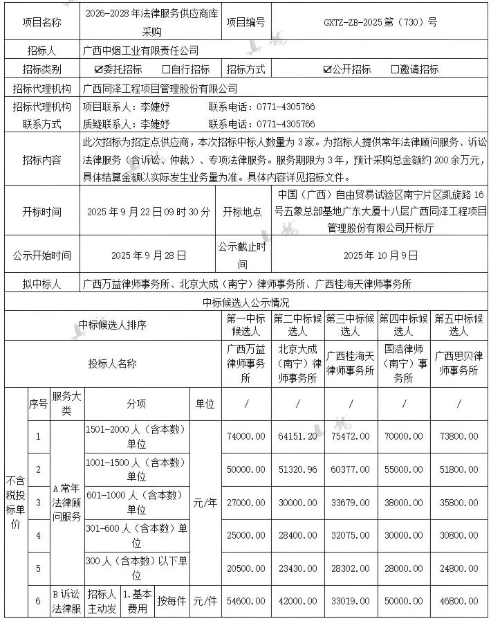 廣西中煙工業有限責任公司2026-2028年法律服務供應商庫采購(項目編號:GXTZ-ZB-2025第(730)號)中標候選人公示